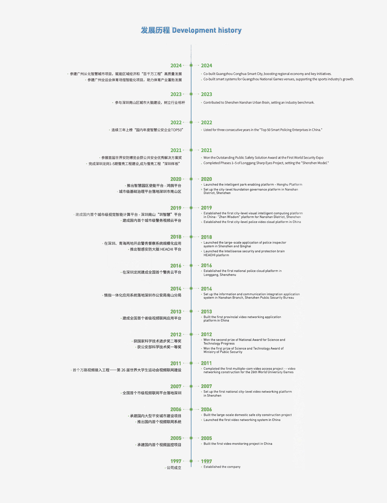 成立以来,公司长期专注于智慧城市场景并且积累了雄厚的资质实力,拥有包括“广东省安全技术防范系统设计、施工、维修资格证(壹级)”“电子与智能化工程专业承包一级”“CCRC信息系统安全集成服务资质认证证书(二级)”“信息系统建设和服务能力CS3等级证书”“CMMI5级资质证书”在内的高、精、专行业资质十余项,成功打造一系列国内标杆项目:建设完成雪亮工程“大满贯”——深圳龙岗区雪亮工程1-5期项目;建设完成国内首个城市级视觉智能计算平台——深圳智慧南山视频汇聚共享应用服务平台;建设完成国内首个城市级警务计算平台——茂名视频云。截止目前,公司产品解决方案已成功应用于全国100多个城市及地区。